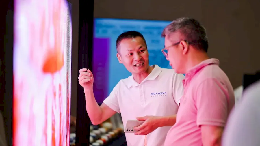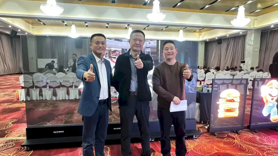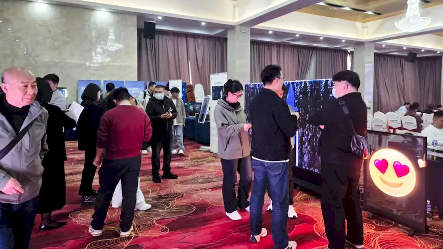 同期,“大屏幕业绩榜 & 百家讲坛”巡展在北京开展。“百家讲坛”由大屏幕显示业绩榜主办,是LED显示行业久负盛誉的全国巡回活动,聚焦产业技术发展趋势与前沿解决方案,为各地经销商、集成商及用户提供深度了解行业风向的交流平台。3台美矽微LED隐形广告机直观呈现透明显示解决方案在商业场景中的应用趋势。该产品采用全球首创的LED全息隐形技术,整机实现即插即用、无需组装,支持单台使用或多台无缝快速拼接,92%的通透率使其在关闭时完美隐形,可轻松营造具有冲击力的裸眼AR视觉效果。美矽微大区总经理卜茂敏现场讲解,详细介绍美矽微全息隐形屏的产品特性、适配场景与服务优势,助力行业同仁深度了解透明显示创新应用。