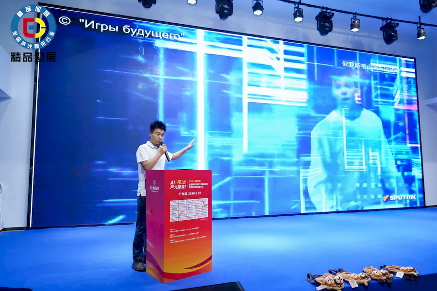 2026全国声光视讯行业精品巡展于广州启幕。该巡展由全国声光视讯行业精品巡展组委会主办,旨在汇聚声光视讯领域的前沿技术与创新成果,展示范围覆盖智慧显示、音视频设备、数字安防、文旅科技等多元应用场景,为上下游企业搭建双向赋能的交流合作平台。展会现场,美矽微展出M系列全息隐形屏,像素间距2.5mm,尺寸1500*2500mm的样机展示方案,直观呈现产品形态。该系列产品具备85%~95%的通透率,可实现整屏透明隐形与空间悬浮影像效果,模组厚度低于2mm、重量仅6kg/㎡,支持柔性弯曲,为商业空间带来电视级画质的透明显示体验。活动现场,美矽微销售经理程永阳登台分享,围绕LED全息隐形屏的核心产品价值、技术亮点及应用场景进行深度解读,赢得现场观众的高度关注与认可。