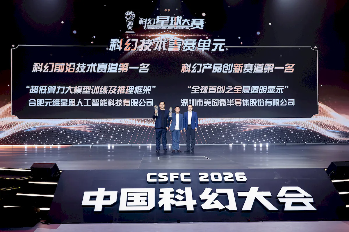 3月29日晚,2026北京科幻之夜暨科幻星球盛典在北京石景山区首钢园四高炉二层启幕。作为2026中国科幻大会的收官活动,本届盛典汇聚科技、文化、产业界重磅嘉宾,在工业遗址与未来科技交融的空间里,共同见证第四届科幻星球大赛荣耀加冕。美矽微凭借“LED全息隐形屏”,斩获科幻技术单元科幻产品创新赛道第一名。
