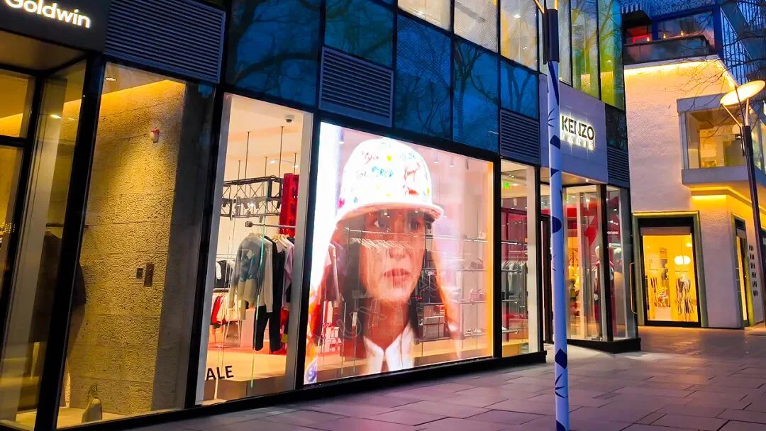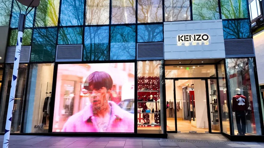 美矽微全息隐形屏具备高感官通透度、高画质的显示特性,以贴附于玻璃表面的安装方式融入临街橱窗立面中,不遮挡采光,也不破坏原有的空间结构,与KENZO的品牌风格完美契合。